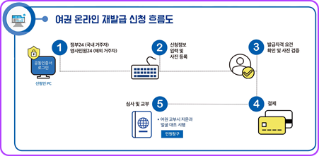 온라인 여권 재발급 신청 서비스는 국내의 경우 정부 24(http://www.gov.kr),