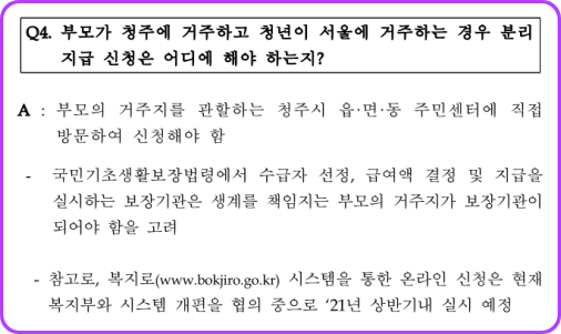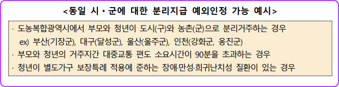 - 예를 들면, 부모는 청주시에 거주, 청년은 서울특별시 구로구에 거주하는 경우 분리 지금 대상 ○