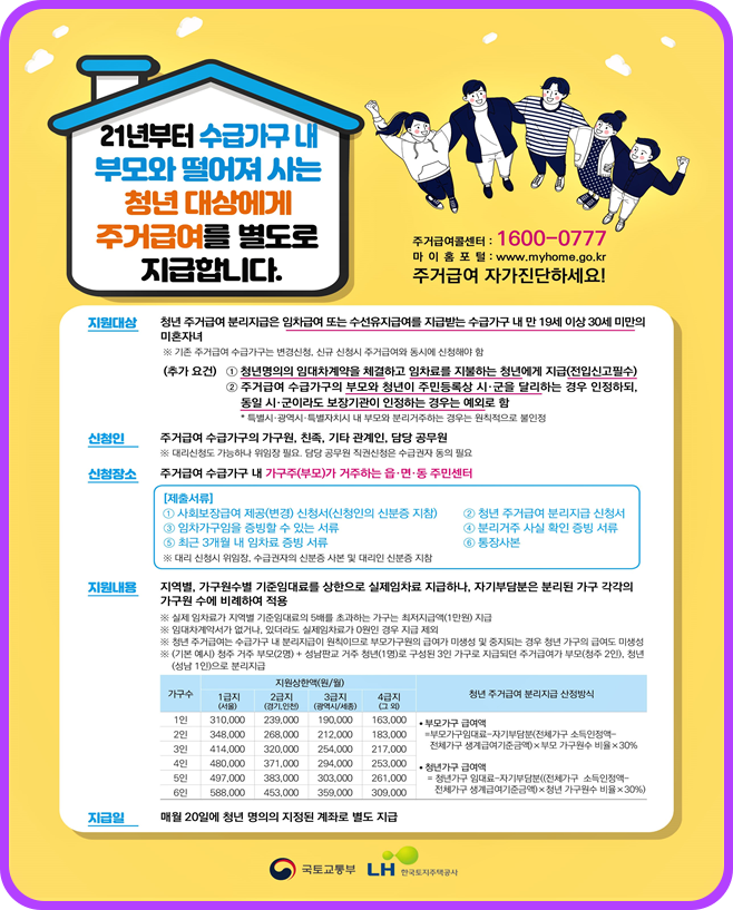 오늘은 학업 · 구직 등의 이유로 부모와 떨어져 사는 청년을 지원하는 '청년 주거급여 분리지급'에 대해서 알아보고자 합니다.