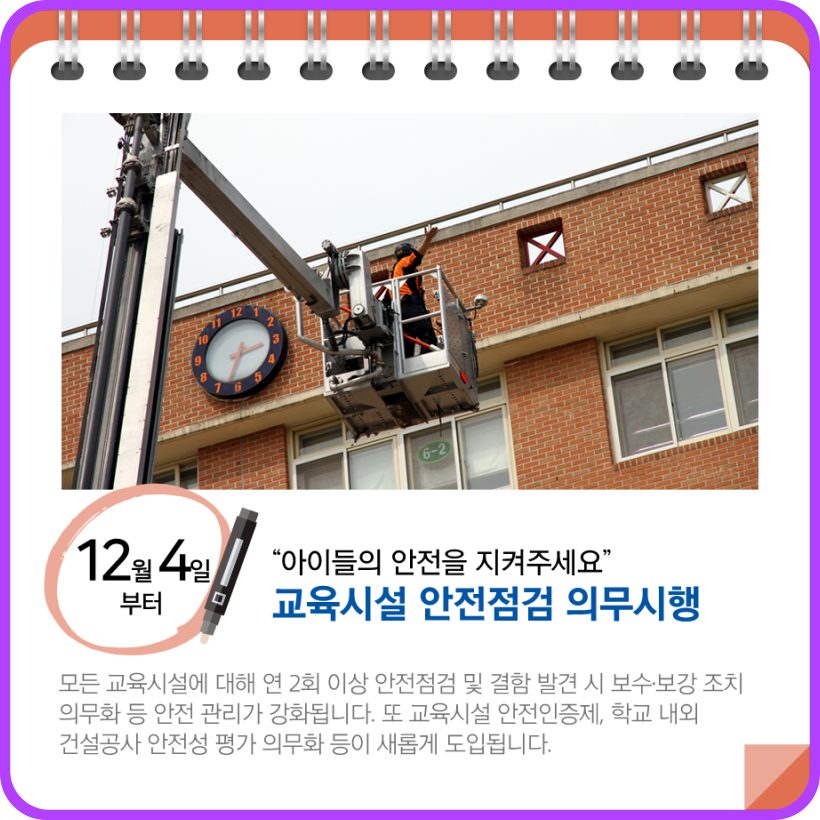 모든 교육시설에 대한 안전점검이 연 2회 이상 의무적으로 실시하고, 결함 발견 시 보수·보강 등의 조치 시행합니다.