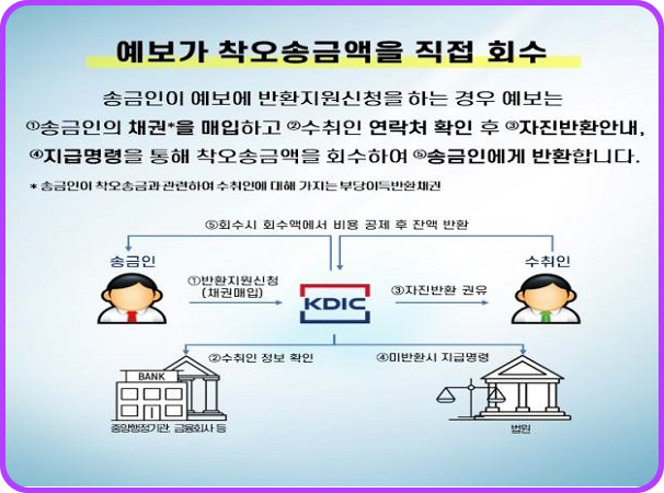 송금인의 신청에 따라 예보는 수취인에게 착오송금 반환을 안내하고 필요시 법원의 지급명령 등을 통해 회수합니다.