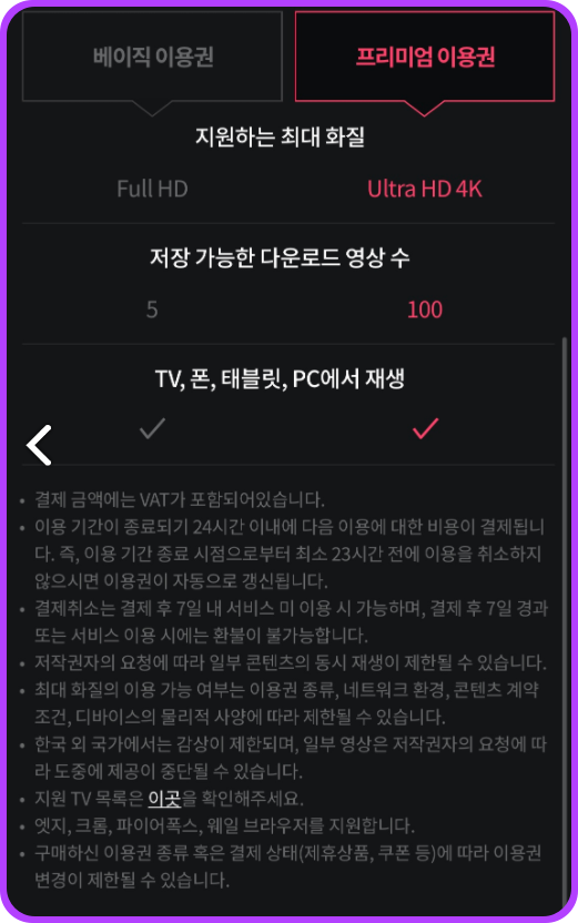 Full HD를 지원하는 기본요금제는 월 7,900원에 저렴하게 이용이 가능합니다. 맨 처음 왓챠플레이에 로그인을 하시면 이렇게 요금제를 선택하실 수 있는 선택사항이 뜨게되는데요, 요금제가 딱 두가지 종류이다보니 많은 고민이 필요 없을 것같습니다. 혼자 이용하신다면 베이직이용권, 여러명이서 이용하신다면 프리미엄 이용권이 좋을것 같습니다.