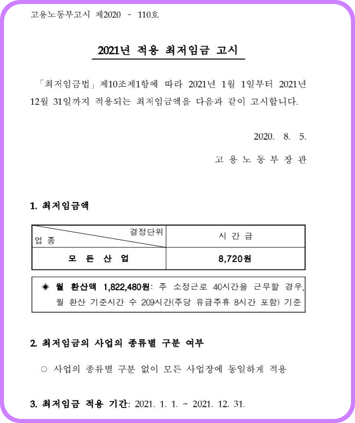 오늘은 2021년도 최저임금에 대해서 알아보겠습니다. 2021년 최저임금은 시간당 8720원(월 기준 182만 2480원)으로 정해졌습니다. 이는 올해 2020년 최저임금(시간당 8590원)보다 1.5%(130원) 오른 금액입니다.