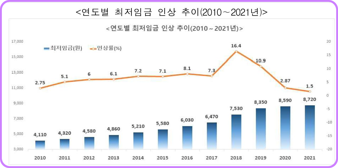 내년 최저임금 인상률은 1988년 최저임금 제도를 시행한 이래에 역대 가장 낮은 수준입니다. 지금까지 최저임금 인상률이 가장 낮았던 해는 IMF 외환위기(1998년 9월∼1999년 8월, +2.7%), 글로벌 금융위기(2010년도, +2.75%) 때보다도 낮게 결정됐습니다. 코로나 19로 인한 여파가 고용상황과 노동시장에 미치는 충격이 매우 큰 만큼, 일자리를 지키기 위한 수준에서 최저임금 인상률을 정한 걸로 보입니다.