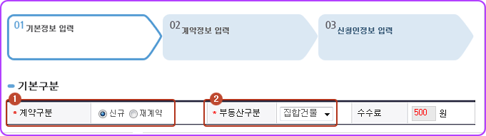 계약 구분에선 신규계약, 재계약 중 선택합니다. 부동산 구분에 건물은 건물 전체가 하나의 등기사항 증명서로 등기된 경우이고, 집합건물은 아파트처럼 각 호별로 각각 등기된 경우입니다. 부동산 구분에 맞게 선택하면 됩니다.