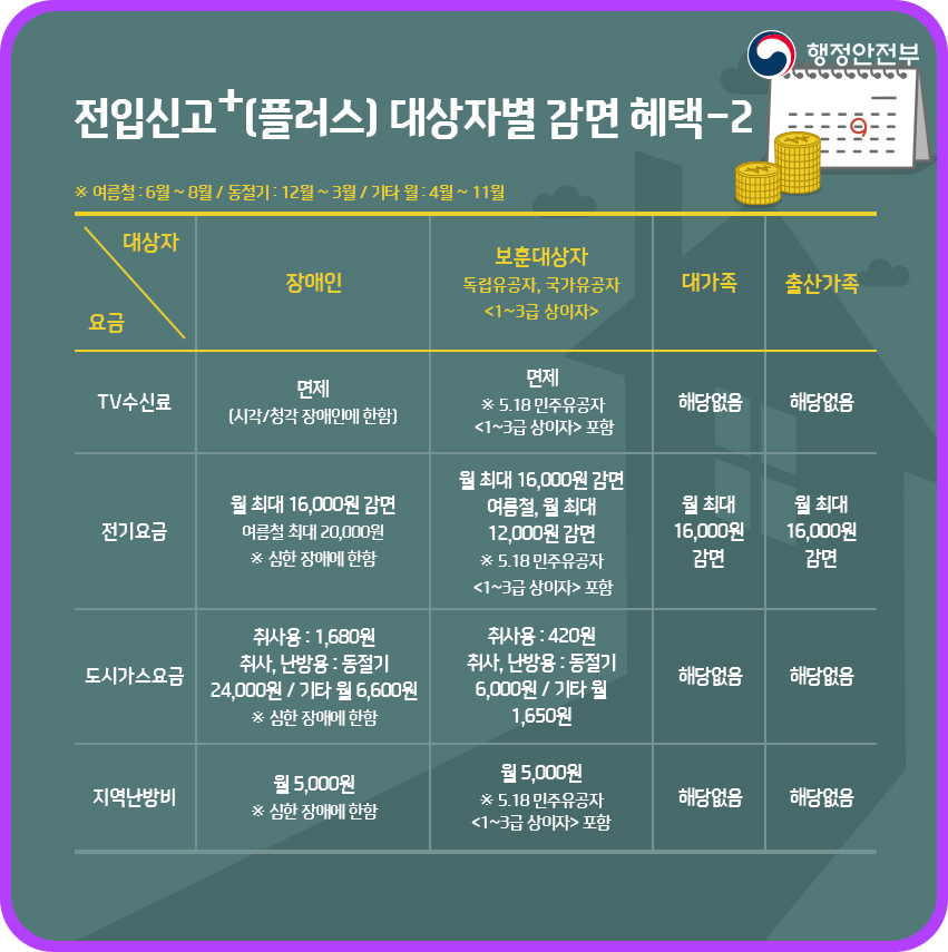 장애인, 보훈대상자(독립유공자, 국가유공자) 대상자분들도 TV수신료, 여름철 전기요금, 동절기 도시가스요금, 지역난방비 감면 혜택을 받을 수 있습니다. 대가족, 출산 가족은 여름철 전기요금 할인을 받을 수 있으니 참고하세요.