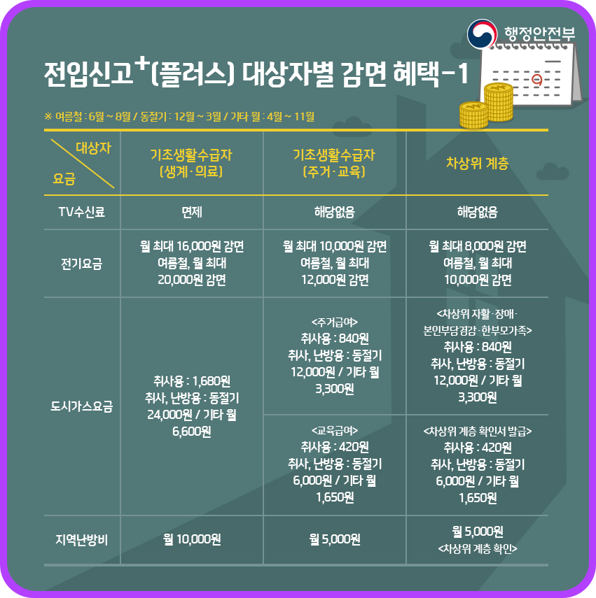 TV수신료, 전기요금, 도시가스요금, 지역난방비가 감면 요금에 해당됩니다. 기초생활 수급자(생계, 의료) , 기초생활 수급자(주거, 교육), 차상위 계층 대상자에 따라 여름철 전기요금 감면, 동절기 도시가스 요금감면, 지역난방비 할인이 있습니다. 감면 혜택을 모르고 받지 못하신 분은 신청하세요.