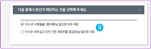 이사 온 사람과 (새로 이사 온 곳의) 기존 세대주와의 관계를 선택합니다.