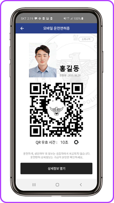 본인 명의로 사용하고 있는 휴대폰에 PASS 앱을 실행하고, 실물 운전면허증을 촬영하면 간단하게 등록 가능합니다. 본인 명의의 스마트폰 1대 1개의 통신사를 통해서만 이용이 가능합니다. 보안을 위해 블록체인 기술을 활용하여 패스 서비스와 경찰청 운전면허 시스템과 연동하였습니다. 실제 운전면허증 사진이 PASS에서 보입니다.